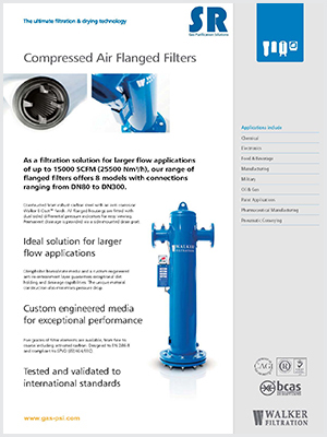 SR壓縮空氣法蘭過(guò)濾器,是針對(duì)大流量壓縮空氣過(guò)濾而設(shè)計(jì)的,最大處理流量可達(dá)25500Nm3/h(15000SCFM),主要應(yīng)用于化工、電子、食品及飲料、加工制造、軍事、石油和天然氣、噴涂噴漆、制藥、氣動(dòng)輸送等行業(yè)。SR壓縮空氣法蘭過(guò)濾器系列產(chǎn)品有8種型號(hào),從DN80到DN300的多種接口可供選擇,最大工作壓力為16barg(232psig),最高工作溫度為120℃(248℉)。