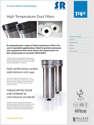 SR高溫除塵過濾器是用最高品質的316不銹鋼制成,最高工作溫度可以達到250℃(482℉),最高工作壓力為16barg(232psig)。一共有8種型號,接口尺寸從1/4"至2",流量范圍從35Nm3/h(20SCFM)到1150Nm3/h(675SCFM)。