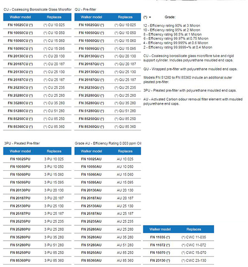 英國(guó)WALKER公司生產(chǎn) (Parker)Finite替代品濾芯,WALKER型號(hào)和(Parker)Finite型號(hào)的對(duì)應(yīng)表如下,每一種型號(hào),都有對(duì)應(yīng)的WALKER替代品濾芯,過濾效果也是等同于或者優(yōu)于原廠濾芯,價(jià)格更親民。