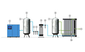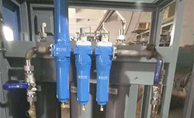 制氮機(jī)生產(chǎn)氮?dú)獾脑斫馕觯簝膳懦蓪?duì)的裝滿碳分子篩(CMS)的壓鑄鋁筒通過上下的均氣上蓋和底座連成整體,形成一個(gè)雙套分離系統(tǒng)。壓縮空氣通過底部的均氣底座進(jìn)入“在線”系統(tǒng),在碳分子篩間流動(dòng),其中的氧氣被碳分子篩優(yōu)先吸附,而氮?dú)鈩t可以順利通過碳分子篩。整個(gè)分離系統(tǒng)每隔一段時(shí)間(預(yù)設(shè)),控制系統(tǒng)自動(dòng)切換