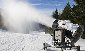 壓縮空氣造雪機的工作原理是先利用空氣壓縮機把空氣壓縮,壓縮后的空氣從噴嘴噴出,因為從噴嘴噴出的壓縮空氣體積迅速膨脹,而導(dǎo)致壓縮空氣迅速降溫成為冷空氣。與此同時,風(fēng)扇把水吹